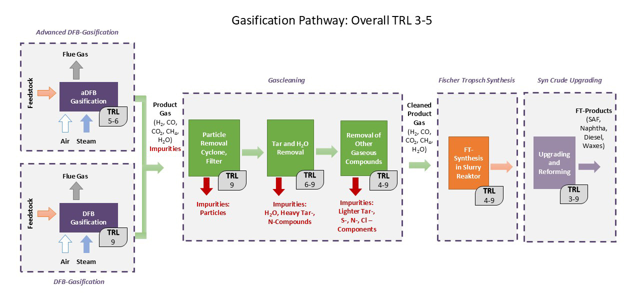 Dual fluidized bed steam gasification is an already commercially used thermochemical technology which produces a highly valuable product gas from woody biomass. The advanced version of this gasifier should be able to handle a wider variety of residual feedstocks and has been erected at a 1MW demonstration scale in 2022 at the Syngas Platform Vienna. For the downstream Fischer-Tropsch Synthesis application, an application dependent amount of gas cleaning has to be done, which reduces impurities like particles, tar components, as well as S-, N-, Cl- and other harmful components to a certain level to prevent unwanted reactions or catalyst poisoning. The FT Synthesis takes place in a slurry reactor, which is at a TRL 9 for big scales (>several 100 MW up to GW Scale), and now under development for small to medium scale Syngas application. After separation of the FT product biocrude, upgrading and reforming steps are performed to obtain the final products SAF, Naphtha, Diesel and Waxes.