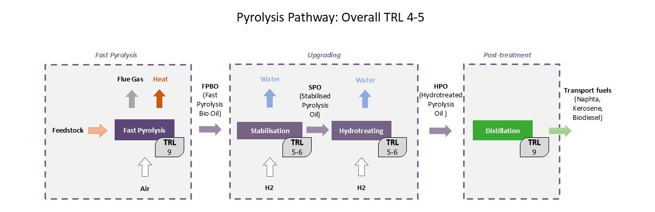 The BioTheRoS project is centered on two thermochemical pathways for advanced biofuel production: pyrolysis and gasification. Although these technologies have differences, they share core steps—converting biomass through the respective thermochemical technology followed by various upgrading processes to produce advanced biofuels. The Technology Readiness Levels (TRLs) vary across these individual process steps, and when combined with the choice of feedstock, they ultimately determine the overall TRL of the process. The TRLs of the process steps and the overall TRL are shown in the following flowsheets: